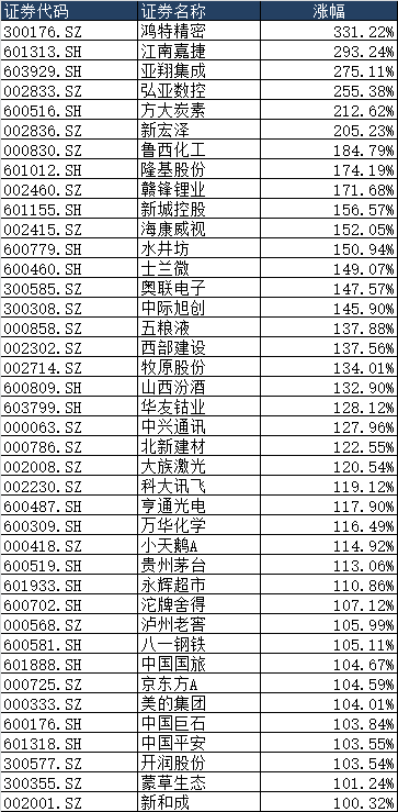 1558只股票跌幅超过20%,非次新股里有40只股票今年涨幅翻倍,除了少数几个重组成功的幸运儿,绝大多数都是蓝筹+白马股,明细如下: