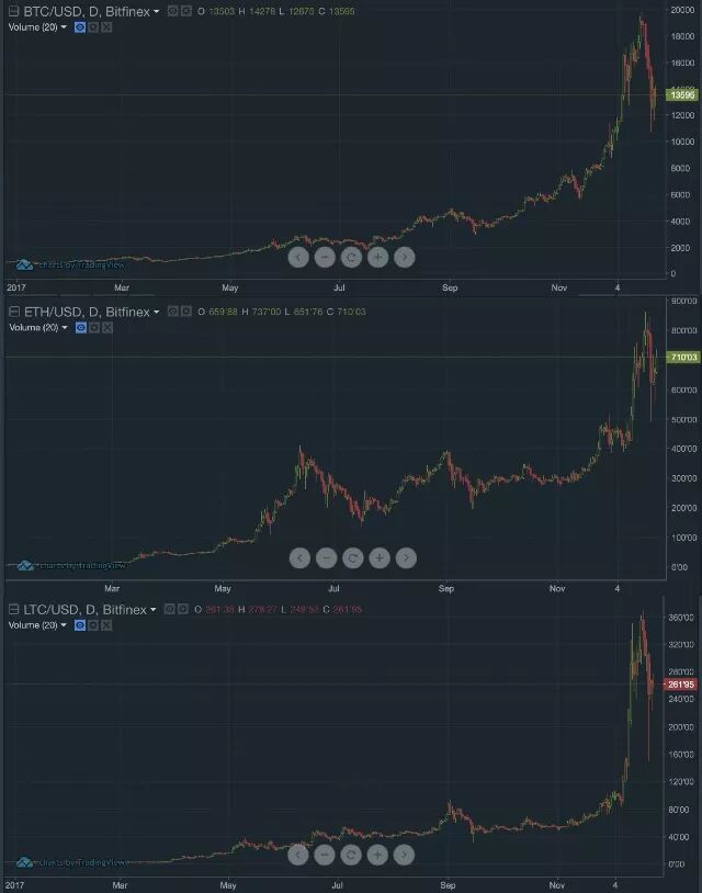最近数字货币像过山车一样,又一次成功吸引了财迷甚至大众的注意。比特币在上周差不多触及2万美元新高后,一周来连续暴跌30%,今天部分收复失地,收获了差不多一个涨停板。回顾整个2017年,要说最赚钱的投资品,不是上证50指数,不是一线城市买房,正是数字货币。一年工夫,比特币最高涨到了20倍!价格疯长的背后,菜鸡甚至听说,杭州有些土豪几个亿几个亿地往里面砸钱。比特币还不是涨得最猛的。其它主流数字货币,像以太币和莱特币,一年上涨超过80倍!比一线城市炒20年房赚得还多!在这样暴富的诱惑面前,没有人能保持平静。所以在菜鸡理财群里,最近讨论数字货币的声音又热闹起来。不少财迷问,错过了几个亿后,现在还来得及吗?甚至有人问,是不是该抄底了?菜鸡的意见很简单:看下面的图,近期的行情像不像一栋栋凸起的高楼?别去抄底,小心"跳楼"!