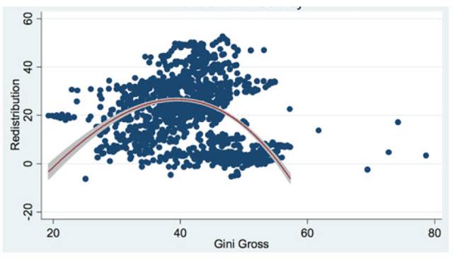 上图取自其论文《经济不平等、政治不平等与再分配》,横轴是再分配之前的基尼系数,代表初次分配差距,纵轴是再分配水平,每个圆点代表1960年到2008年间的66个民主国家,倒U型的红色曲线则是拟合结果。