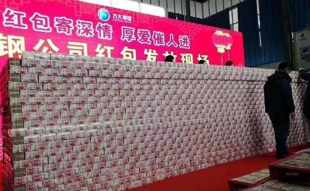 周五的时候各大门户站都推送了一条新闻,某钢铁厂用5亿现金堆砌了一座墙个,用来给将近2万员工发红包,平均每人可领将近3万元。注意是红包,不是年终奖,年终奖另算。现场气氛热烈,锣鼓喧天,还有游龙舞狮表演,发钱一直发到晚上将近8点才发完。