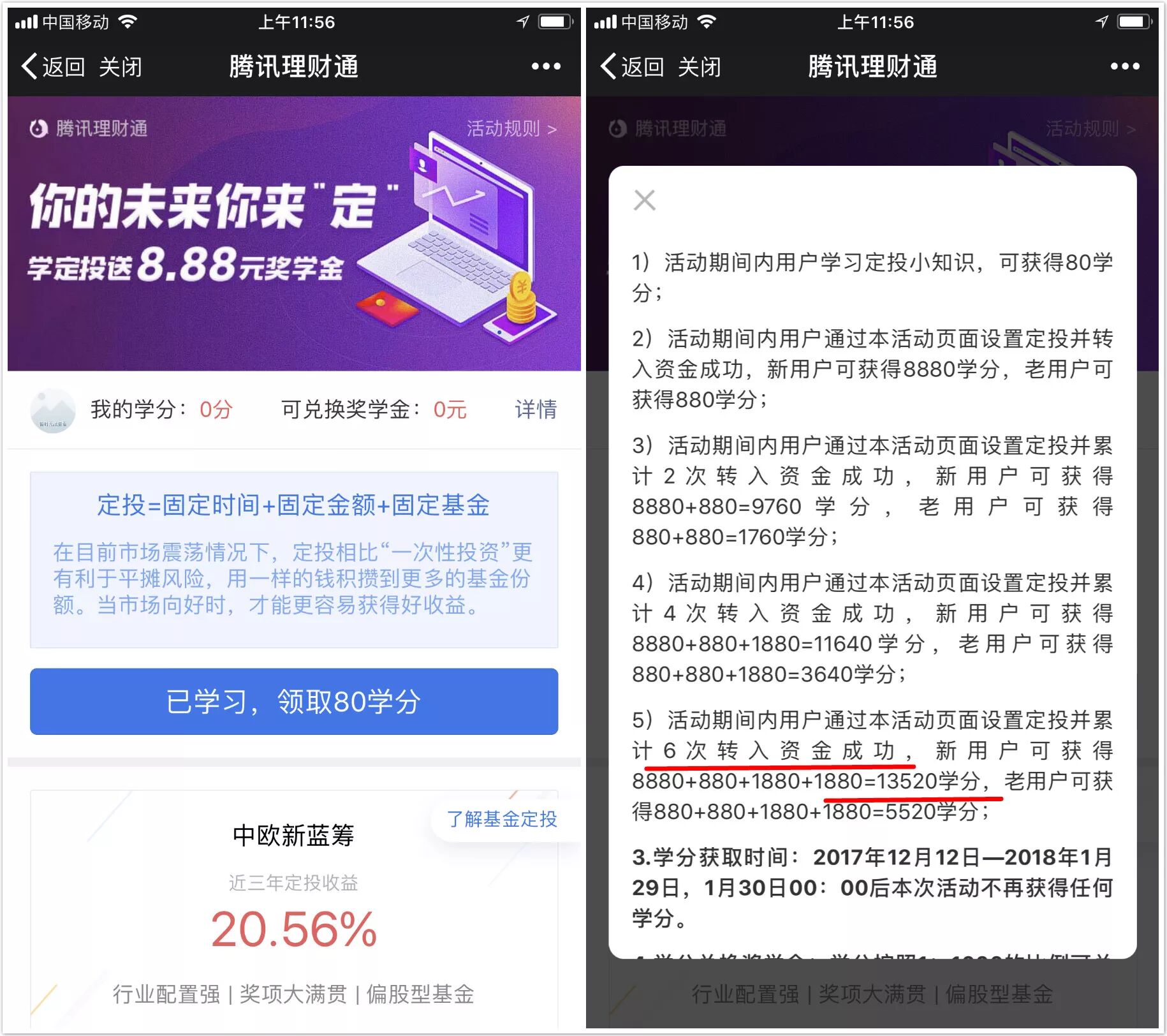 昨天支付宝勾引全国人民晒账单的时候,腾讯拿下了基金销售的金融牌照,今后可以自己卖基金,直接去抢支付宝的生意。菜鸡知道,大佬们一死磕抢生意,就喜欢发红包送补贴,咱们吃瓜群众的幸福时光就到了!所以今天一早在微信里的腾讯理财通里寻寻觅觅,果然找到马化腾正在发的一个小红包。微信发这个红包,是为了推广中欧新蓝筹混合A(166002)这一只基金的基金定投。新用户只要首投100块,就能领到8.88块的福利。继续买的话,能最多薅到6次羊毛,一共最高白拿13.6元的补贴。菜鸡已经帮你们算清楚了,如果单为薅羊毛,你就连续六天每天定投100元,就能将全羊毛薅到手。老用户的待遇要差一点,最多拿到5块多的补贴。不过相比这十来块钱的小羊毛,菜鸡觉得大家更应该关注两个问题,为什么小马哥要推广基金定投这种玩法?这只基金能不能帮咱们赚大钱?小马哥这次力推基金定投,其实也是因为,这是最适合小白买基金的入门玩法。基金定投是玩基金的简单操作,是指在固定的时间、定期以固定的金额,购买某只基金。这种玩法的优点是,不用费脑,且中长期看赚钱的概率非常高。初入市场的财迷可能要说,我就盯着市场,看到价格合适的时候一把搞进,价格涨上去一把卖出多滋润,赚得肯定更多。高抛低吸,这个说起来容易,如果你真能精准踩在底部,抛在高位,那估计早就财务自由了。大多数想高抛低吸的散户,最后都成了韭菜。长期定投就不一样,它的好处很明显,不用管市场行情,下跌时你花同样的钱买到更多的份额,价钱更便宜了。中长期来看,基金净值上涨是大概率事件,你就可以赚得更多。菜鸡测算了一下,如果你定投沪深300,只有在极端情况(牛市开始,熊市卖出),才会出现亏损;剩下测算不管怎么来,都是盈利的,年化平均在14%以上。特别是在当前的情况下,2018年市场也不太可能走出大牛市,咱们小白还是玩一玩基金定投赚点安稳钱更好。玩定投的话,市面上也有几千只基金可以选。小马哥为啥就甘愿把补贴资源全部投到这一只基金上?菜鸡就带大家来看看,中欧新蓝筹混合A这只基金到底牛在哪里?中欧新蓝筹混合A成立了有10年,经历过市场检验,而且近5年的业绩都排在前25%,重仓的都是大盘蓝筹和白马。最近三年定投这只基金的话,你可以赚到20.56%的收益,这在基金定投中已经算非常不错的业绩。中欧新蓝筹混合A是一只主动管理型基金,基金经理的角色就非常重要。他家的基金经理周蔚资历非常老,有16年以上的证券从业经验,对蓝筹和白马股的研究很深刻。这只基金不仅在行情好的时候涨得厉害,在行情差的时候也非常抗跌,基金的波动性很小,是一个非常适合小白来做基金定投的产品。再加上这只基金是混合型基金,风格追求的是稳健,而且也配置了一些固定收益的低风险产品来作对冲,就能在行情不好的时候降低亏损的幅度。仔细评估之后,菜鸡觉得马化腾选的这只基金,还是比较靠谱的,大家不妨轻仓尝试。但好学的小财迷们可能会更关心,我们怎么能选出更多的类似的好基金呢?菜鸡之前专门写文章介绍过挑选基金的方法,今天再来简单说一遍,我们要从五个方面去考察主动型基金:第二看业绩排名,业绩代表历史但对未来有很好的参考性;第三看基金经理牛不牛,因为主动型基金的业绩受基金经理个人水平影响非常大;第四看技术指标,例如反映抗跌能力和波动幅度的最大回撤指标和夏普比率;学会选牛基的方法,你赚的钱肯定要比马云马化腾发的红包多很多。不过话又说回来,眼看支付宝和微信在2018年又要在卖基金这个生意上开战,各种红包补贴估计是停不下来的。菜鸡会帮大家盯紧,有羊毛机会就吹哨子喊人,大家一起干,不薅白不薅。最后插一句,关于适合定投的好基金,菜鸡之前其实也介绍过不少了,大家可以来评论区晒一晒收益嘛。发自我的 iPad
