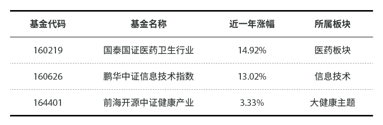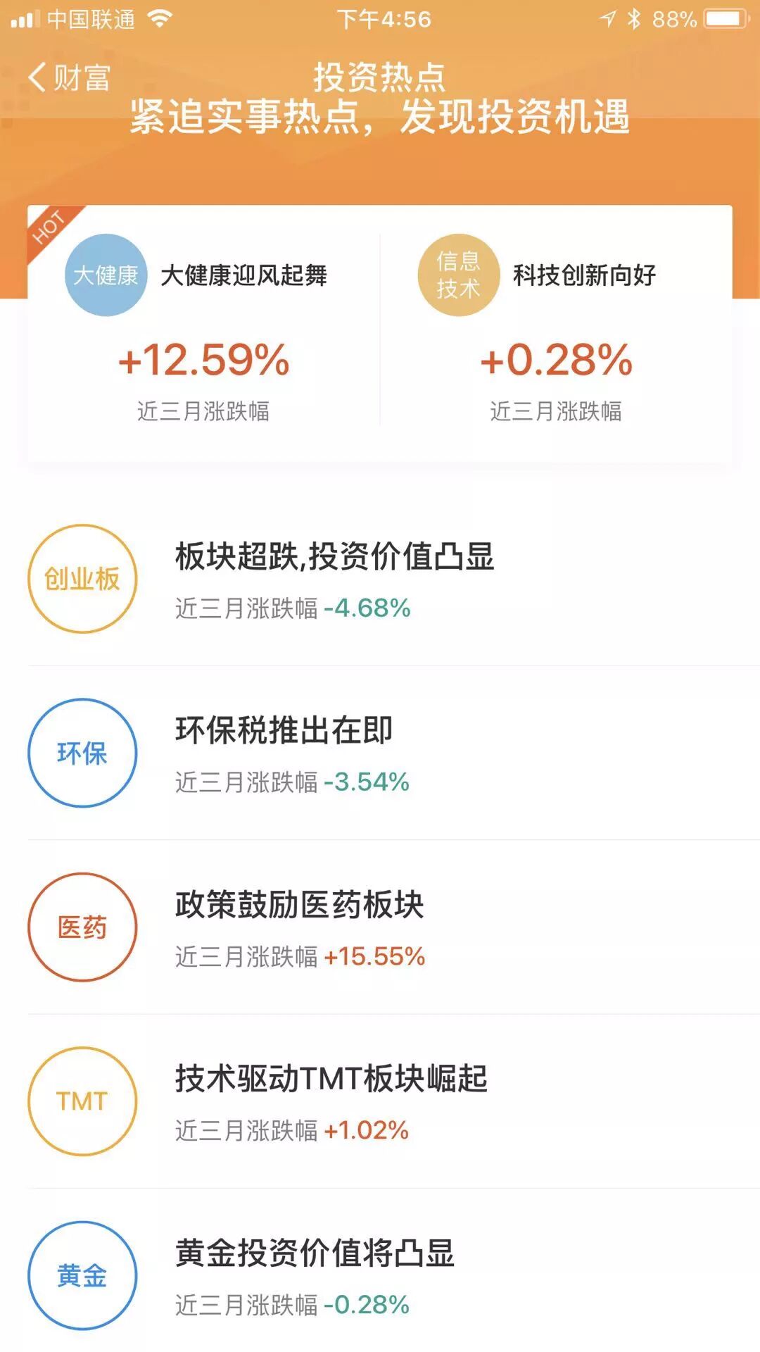 国内大多数财迷的理财意识,本来就是从支付宝推出余额宝开始启蒙的。支付宝App里,刚把理财板块的"财富"栏目,提到了固定的一级菜单栏,一打开应用就能看到。而且还将一些历史收益超高的基金放在显著位置,这就给小白用户提供了很大的方便。这个"财富"在菜单栏曾经一度出现过,如今重回支付宝,相信是迎合了当前亿万理财意识觉醒用户的需求,让理财玩得更方便。 马云的巨富身家,是那个"让天下没有难做的生意"的使命成就的;估计马云现在还有第二个使命,就是"让天下没有难理的财"。 目前支付宝"财富"栏目里,理财产品门类比较全了,产品数量很多,除了余额宝等个别是自家的产品外,大多都是和基金、资管等第三方金融机构对接的。除了股票和P2P没有外,常见的主流品种,像活期的货币基金、固定收益的定期理财、浮动收益的公募基金等。方便是方便了,但产品这么多,都看花眼了,普通财迷该怎么挑啊?哪些可以赚得更多、赚得更稳?要是财迷们有兴趣,无马哥今后会陆续来帮大家科普和筛选。这里先提醒一句:"财富"页面的内容是个性化的,有些子栏目,每个人显示出来的产品不一样,比如"为你优选"。 而有些子栏目显示的产品都一样,比如页面最下面的"投资热点"。该栏目里目前推荐了7个板块的基金,无马哥今天就先来帮大家挑一挑。无马哥看了一下,支付宝目前推荐的这7个热点板块,有6个板块都比较有投资价值——板块目前的估值不高,除了黄金板块外。比如,无马哥一直看好的信息技术行业、医药行业,目前都处于估值略低于历史均值的位置。(估值历史分位数的数字越低,下跌风险越小,而上涨概率越大)但这些板块中,支付宝给我们推荐了20只基金,我们也不能全都买不是?所以还得优中选优。无马哥决定帮没时间自己去考察的财迷,筛选出3只优中选优的好鸡。名单最后会列出,我们先简单看下筛选的简单思路,这样你以后也可以自己来。估值低,就意味着下跌的空间有限,财迷们赔本的可能性较小。但投资并不是只要便宜就能买,我们还要关注未来投资前景是否明朗。在这些热点板块中,无马哥觉得,发展前景比较确定的,有信息技术行业、TMT、医药行业、和大健康这几个板块。TMT(科技、媒体和通信),包括信息技术,一直是无马哥比较看好的板块。5G、人工智能、自动驾驶等新技术,不断给整个板块带来机遇。另外,国内企业在这方面的全球竞争力也越来越强,相信未来收入和盈利快速增长的机会,仍将持续一段不短的时间。医药行业的投资机会,无马哥之前也介绍过,适合长期布局。大健康这个概念,是支付宝推荐里的第一名,融合了医疗保健、食品安全、环保等三方面的机遇,是综合性比较强的投资方向。伴随着我国人口结构老龄化、重视生活质量提升等趋势,相信这个板块是未来10~20年中,不容错过的投资机遇。无马哥从这几个板块推荐的十几只基金中,选出3只适合财迷们入手的基金,供大家参考。