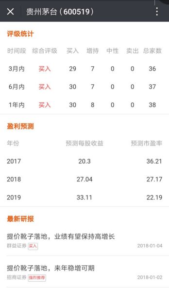 输入代码或者股票简称就可以搜索到最新的个股评级、盈利预测、详细研报,我随便搜了一下贵州茅台,出来的页面非常清楚简洁,哪怕是上了年纪的大龄读者应该也没有使用障碍。