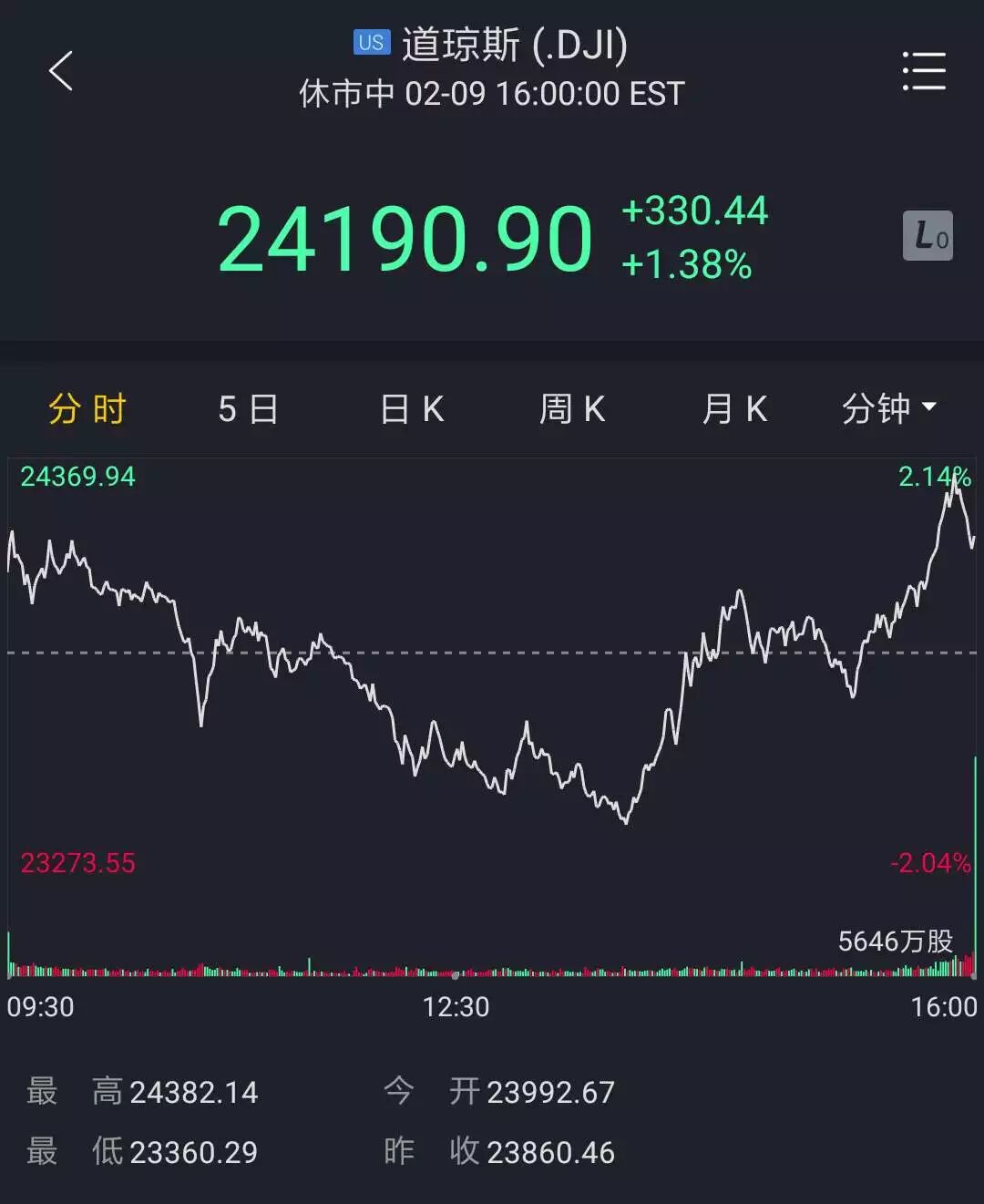 高开低走,盘中一度下跌500点,但从半夜1:40开始强力反弹,最终实现将近1000点大逆转,收盘上涨1.38%