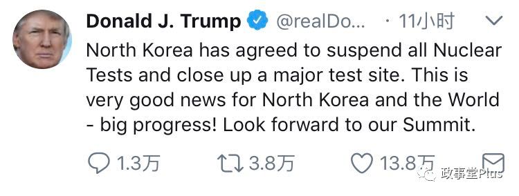 这条推特的背景,是据朝中社21日报道,朝鲜最高领导人在昨天举行的七届三中全会上宣布,朝鲜将从21日开始,不再进行任何核试验和洲际弹道导弹发射,废弃朝鲜北部核试验场。只要朝鲜不受核威胁挑衅,朝鲜绝对不使用核武器,不泄露核武器和核技术。并集中全部力量发展经济,提高人民生活水平。