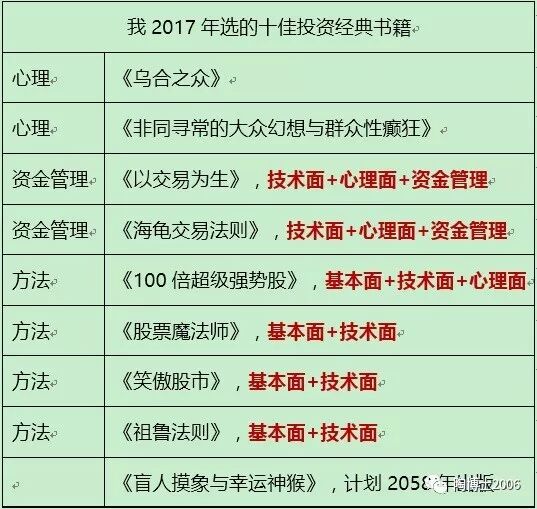 我的投资分析方法是基本面+技术面+心理面,我认可的交易三要素是心理、资金管理和方法。我2017年选的十佳投资经典书籍,基本上都是围绕上述关键词而选的。