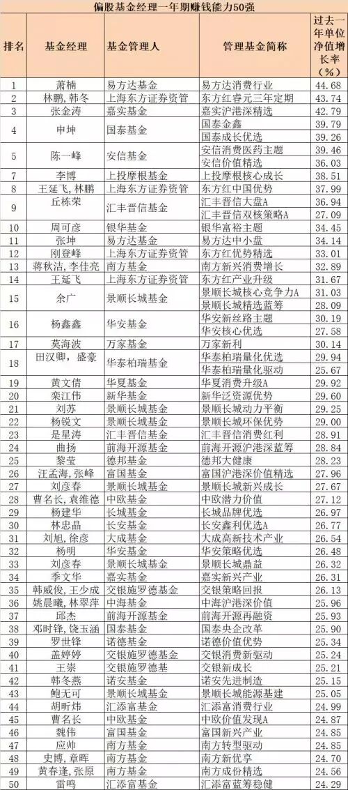 小牛选取截至6月30日任职满一年以上的基金经理作为考察对象,对其管理的基金产品在过去一年的单位净值增长率进行排名,管理多只基金的以其表现最好的那只基金纳入比较,从而得出了一年期主动偏股基金经理赚钱能力榜,截取排名最高的50位基金经理或者组合进行展示。见下表↓↓↓