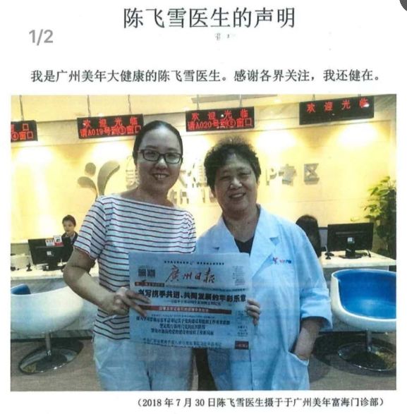 文章里面最惊悚的部分是美年健康竟然冒用一个去世一年多的医生的执业资格,给客户签发体检报告,这条只要坐实这家公司就完了。好在这种生死大事非黑即白,很容易反证,美年健康让陈飞雪医生举了一张7月30日的广州日报合影。话说那个自媒体作者发文前都不核实的吗,一个人死没死这么重大的信息,稍微打听一下就有结果,这竟然也能搞错....