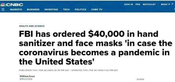 4、CNBC报道美国的FBI采购了4万美金的口罩和洗手液,我看了标题后觉得真踏马无语.....4万美金才几个钱,能买个啥呀,但这就是美国,新闻自由,人家想爆就爆,政府无权干涉。