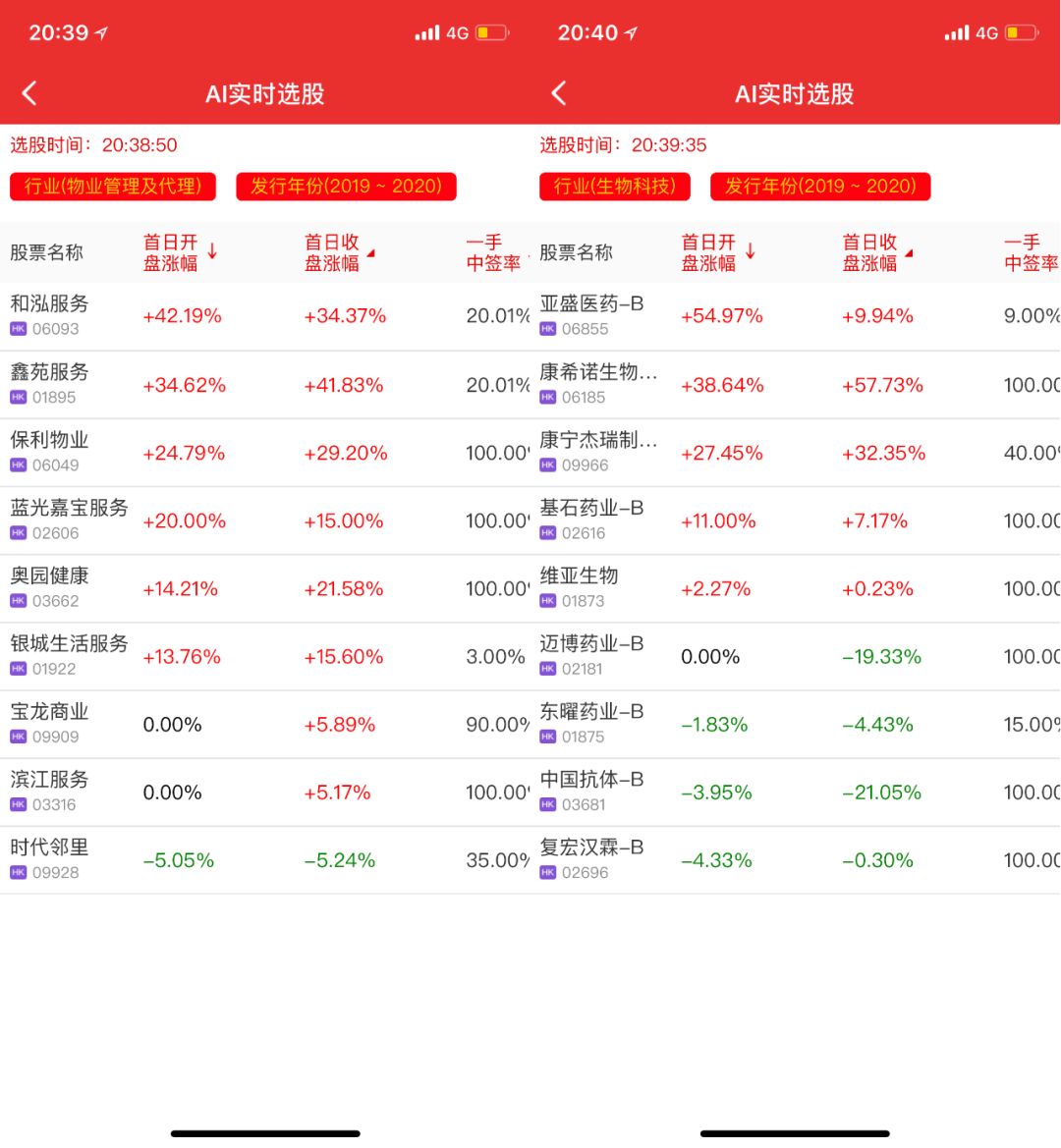 这个月港股打新股又迎来一波热潮,回顾2019年港股新股表现,我发现了两个港股新股板块的申购盈利概率比较高"生物医药板块+物业管理板块",因为年前港股新股保利物业100%中签率,首日收盘大涨近29%,上周港股新股物管股,兴业物联,超过500倍超额认购,目前正在连续申购到本周五的物管股,烨星集团,也超过了500倍,这两只都是小盘物管股,中签率比较低,看运气!我用利弗莫尔证券AI选股看了最近1年这两个板块的表现