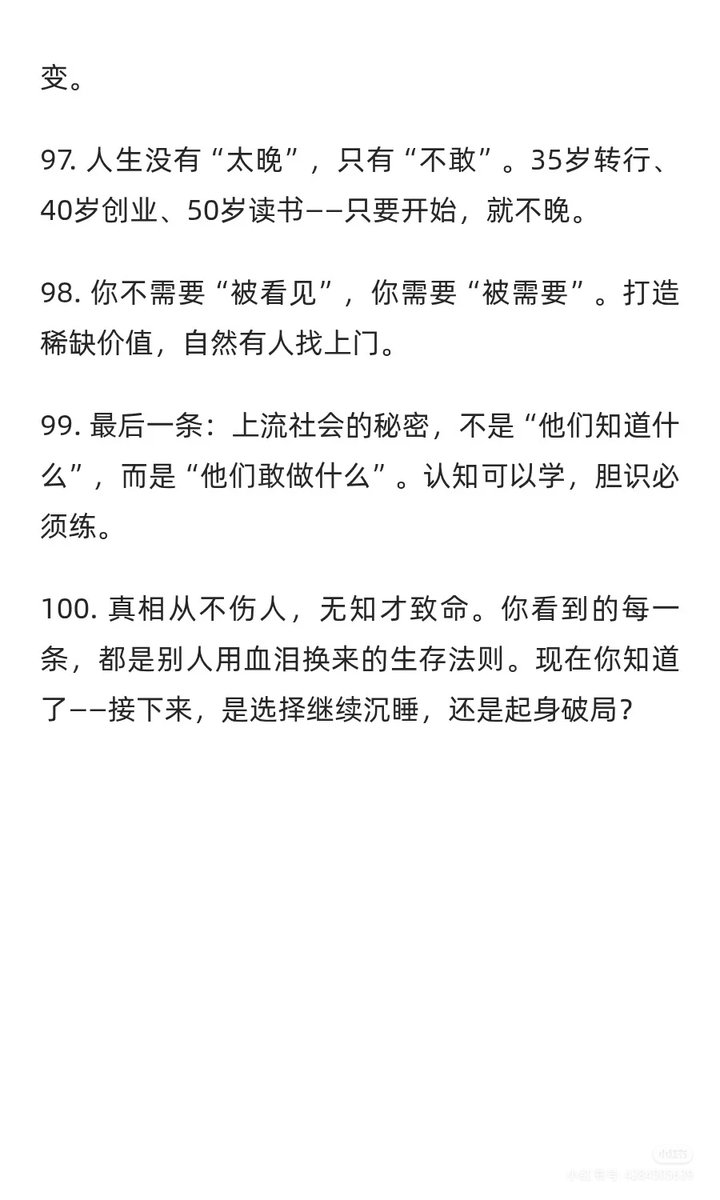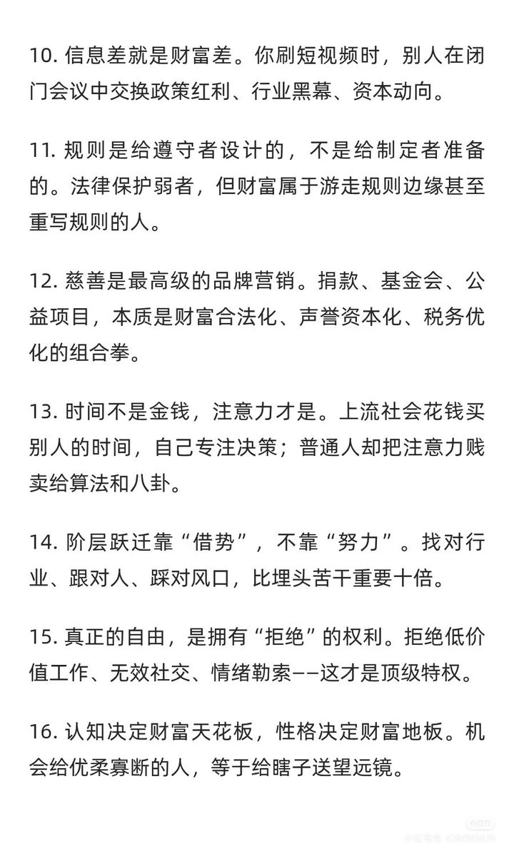 发现股市能赚到10个亿以上的身边朋友,还是巴菲特段永平这样的超级富豪,都有如下共同特征。 1,坚信自己永远对,不需要任何其他人认可或反对 2,永远明白自己是和市场契合,不是挑战市场3,永远只和市场做交易 4,永远潜伏,买低位最好,买在当时的价格最高处也是潜伏,因为目标更高 5,永远满仓,又不是来玩,没有仓赚啥钱6,不带杠杆,杠杆会让人失去常态 7,非常真诚,他能想到的都会和你说,不怕你学去了,理解了和做到还隔着万里路 8,明日之市场,今日之投资,题材热到烫手时候,他们会说我去年买好了,我几块钱买好了的9,标的没有达到预期时候不会换股,除非发生质的变化 10,不会市场波动影响自己心情,会理解市场波动是到目标价格的必有过程