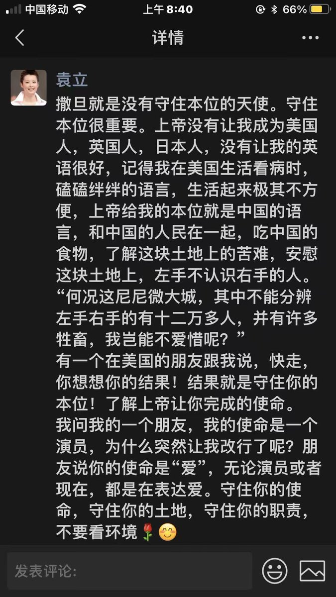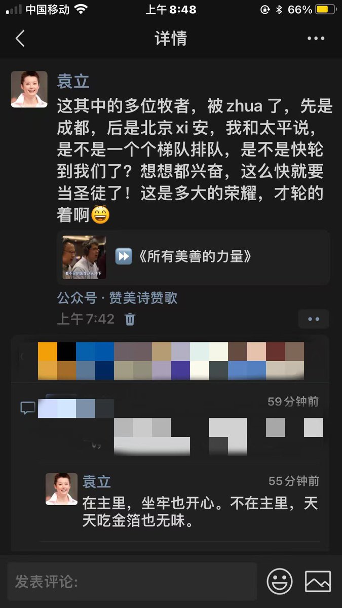 20小时如果说对那片土地心存希望,那是因为还有袁立这样的人。 袁立说: "很多牧者被抓了,先是成都,后是北京。我跟太平说,是不是一个个排队,是不是快轮到我们了?想想都兴奋,这么快就要当圣徒了!这是多大的荣耀,才轮的着啊。" "在主里,坐牢也开心。不在主里,天天吃金箔也无味。"
