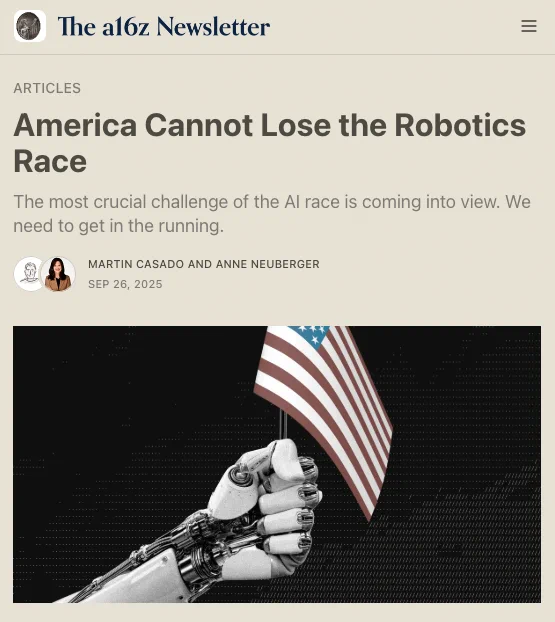 "This is our wakeup call. The leadership of the United States has been bold in defining and defending the AI software stack; now in concert with its most relevant allies it must lay the groundwork for a defensible AI robotics stack. There is time, but not much. The most crucial challenge of the AI race is coming into view. We need to get in the running." @martin_casado @AnneNeuberger