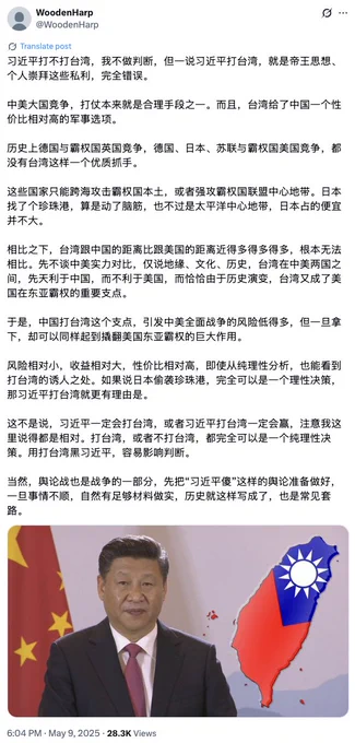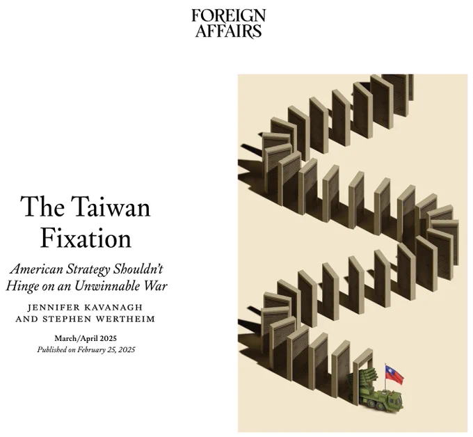 台湾问题,今年Deep State发了两篇文章,都谈到一个主题:不要把台湾看得太重,丢了也就那么回事,不会从根本上损害美国利益。这是比较新的动向。 为什么Deep State要放这个话?我之前发过两条,基本把川普政府和Deep State各种心态提前说透了。 台湾确实重要,美国能不丢台湾还是尽量不丢台湾。但现在中国实力太强,美国又必须做好中国拿下台湾的准备,那就需要把美国在印太的核心利益和台湾脱钩。一方面提前做好战略和舆论准备,做好备选方案,至少装出"倒驴不倒架"的姿势。另一方面说不定还能忽悠住中国,反正你们中国拿不拿下台湾,我们美国还是印太老大,那你们岂不白忙活,所以还是别费那劲了。