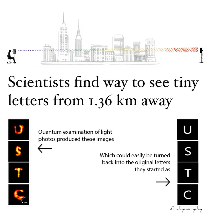 CHINESE SCIENTISTS FOUND a way a person can read the smallest letters on an optometry chart – from a distance of almost a mile. Tests showed that with the new device, they could read tiny letters, just a millimeter wide, from a distance of 0.85 of a mile, which is 1.36 kilometers. The distance was not just too far for the human eye, but also for a normal telescope—both of which work by gathering light waves. Instead, the scientists used a device which fired eight laser beams at the target, and then used two telescopes to collect the complex reflections – which were then moderated by computer to recreate the letters. The method is called intensity interferometry, because it measures the way photons of light interfere with others at a quantum level. . QUANTUM PROCESSING To explain it simply, the light waves that enable humans to see objects work by normal physics—light bounces off an object and is perceived by our eyes. This is fine for most cases. But to extend the process to smaller objects at greater distances, the scientists, led by Qiang Zhang from the University of Science and Technology of China, realized that they could look at the way individual photons of light "bunch together", following the strange, physics-defying rules of quantum mechanics. By using computers to moderate the resulting reflections (and in future, they'll use AI to speed this up), the letters can be accurately reproduced. "The new work represents a significant technical advancement in imaging distant objects that do not emit their own light," said optics researcher Shaurya Aarav from Sorbonne University in France, interviewed in Physics magazine. The research was published in Physical Review Letters, link provided separately.