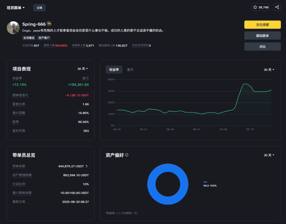 币安交易员——Spring-666|现货跟单 30 天体感 #币安实盘聪明钱 他的交易更像是情绪币单标的波段手:近 30 天收益率 +72%、回撤 ~16.8%、夏普 ~1.66,胜率很高(≈96%)但持仓高度集中(近 30 天基本只做 WLD,仓位偏单一)。曲线结构是:长时间横着做 T → 9/9 左右爆发 → 高位平台。跟随者整体收益为负,说明不少人追在拉升后进场。