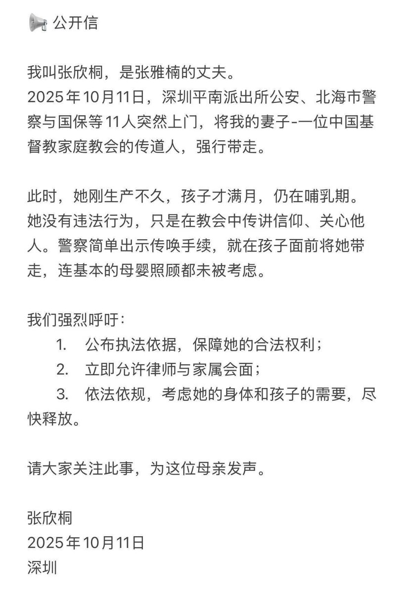 #锡安教案 #锡安教会大抓捕 我叫张欣桐,是张雅楠的丈夫。 2025年10月11日,深圳平南派出所公安、北海市警察与国保等11人突然上门,将我的妻子-一位中国基督教家庭教会的传道人,强行带走。 此时,她刚生产不久,孩子才满月,仍在哺乳期。 她没有违法行为,只是在教会中传讲信仰、关心他人。警察简单出示传唤手续,就在孩子面前将她带走,连基本的母婴照顾都未被考虑。 我们强烈呼吁: 公布执法依据,保障她的合法权利; 立即允许律师与家属会面; 依法依规,考虑她的身体和孩子的需要,尽快释放。 请大家关注此事,为这位母亲发声。 张欣桐 2025年10月11日 深圳