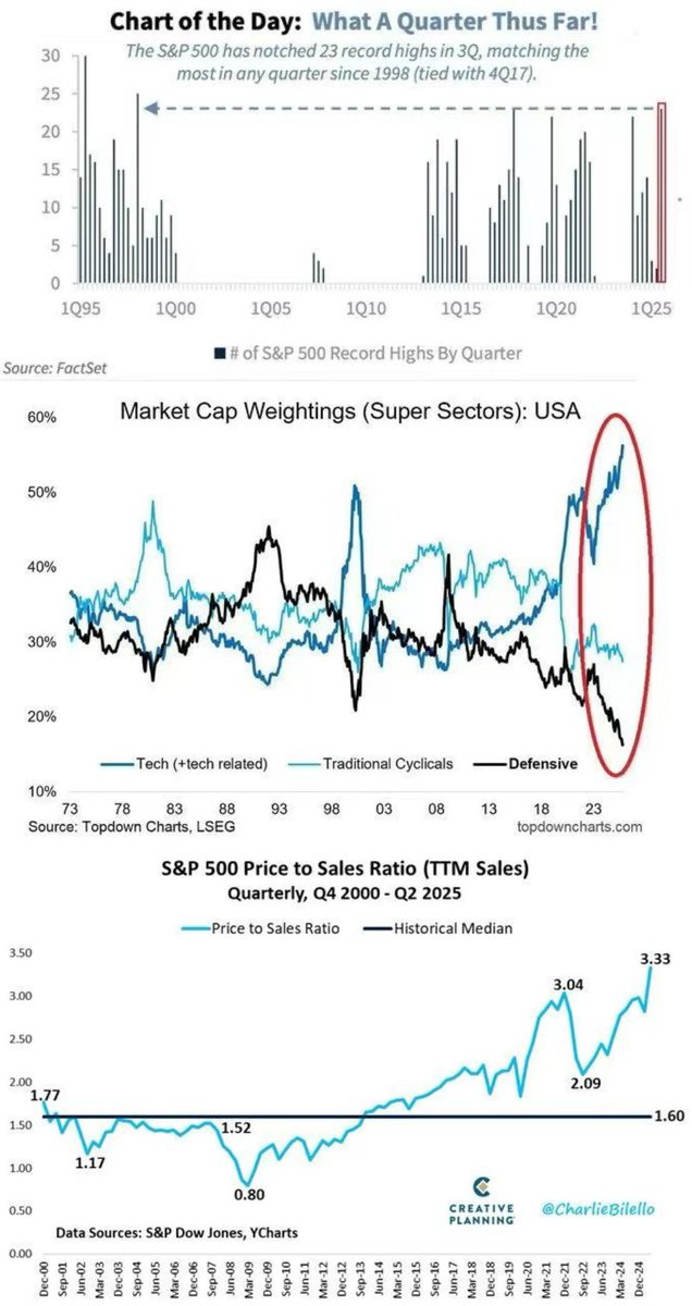 上季度,标普500指数创下23个历史新高,创下 1998年以来的最佳连胜纪录。 这也与2017年第四季度观察到的市场运行一致。 另外,当前,美国科技股占美国股市总市值的 56%,创下历史新高。 与此同时,防御性股票仅占 16%,创历史新低。