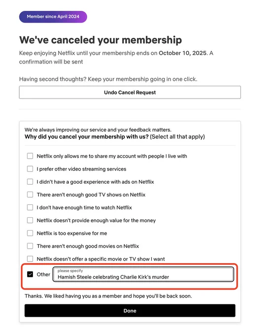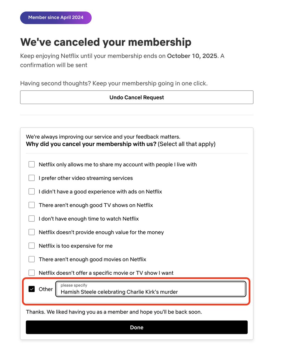 Just cancelled my Netflix subscription. If you employ someone who celebrated the murder of Charlie Kirk and makes content that pushes pro-trans content on my kids... ...you will NEVER get a dime of my money It's as simple as that.