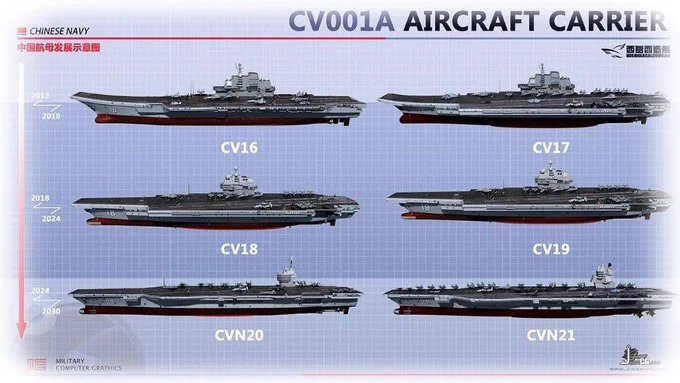 中国人民解放军海军2030年前的航母建造计划:到那时,中国预计将拥有六艘航母,其中三艘为核动力航母。 目前已有两艘航母服役,另有一艘正在最终海试中。第四艘核动力航母正在建造中。