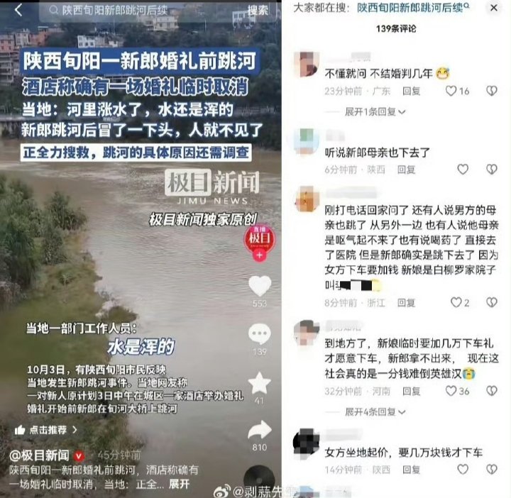 22h陕西旬阳一新郎在结婚当天跳河,具体是因为什么跳河,目前最广泛传播的是新娘临时加价要下车礼,不给就不下车。 当然了,详细情况还有待后续通报。 但不管情况如何,跳河这种行为很愚蠢也不值得。